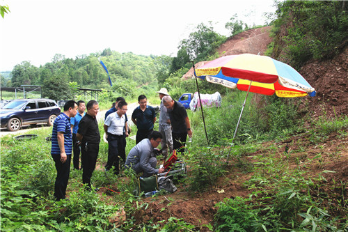 ??? 8月7日上午,鎮巴縣長嶺鎮依然是空氣潮濕、天氣悶熱。檢查組前往漢中市鎮巴縣長嶺鎮望月村,對地質調查所一部承擔的《陜西省鎮巴縣三元-長嶺地區鉀鹽預查》100km的1:2.5萬重力剖面勘查項目進行了檢查。該項目主要任務是:結合1:20萬重力圈定的低重力值異常區,開展重力剖面勘查,進一步確定鉀鹽濃集中心與鹽構造,初步判斷規模、分布特征,為優選鉆孔提供依據。該工區山高陡峭、叢林密布,勘查工作異常艱難。