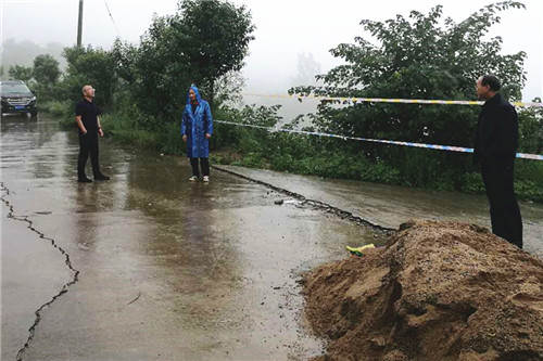 ??? 按照陜西省突發地質災害應急排查突擊總隊指示要求,本著“為政府分憂,為社會服務”的宗旨,8月20-21日,由主持公司黨政工作的黨委副書記、紀委書記李新勝帶隊,前往寶雞市眉縣楊家村冒雨開展了地質災害應急排查工作。公司副總經理龐日軒、地災監測中心技術骨干及相關部門技術人員共11人參與應急工作。